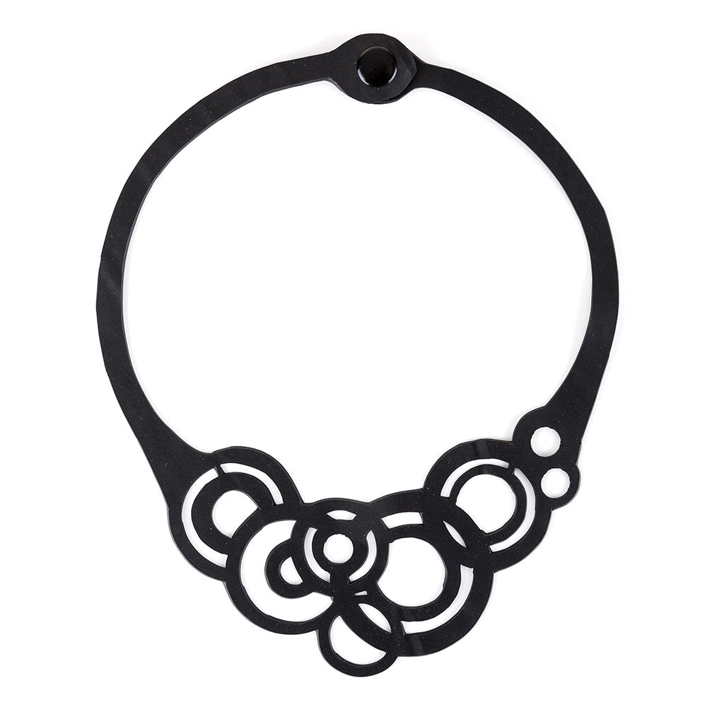 The design of our Circular Rubber Necklace uses a series of eccentric circles to create a sense of movement and vibrancy. It represents the eternal flow of the recycling movement and has been created using the reclaimed rubber of tyre inner tubes. The rubber gives the necklace a soft and comfortable feeling, making this necklace both practical and beautiful.